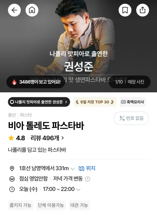 나폴리 맛피아 식당 이름은 비아톨레도 파스타바로 캐치테이블 앱에서 검색하시면 예약과 리뷰를 확인하실 수 있습니다.