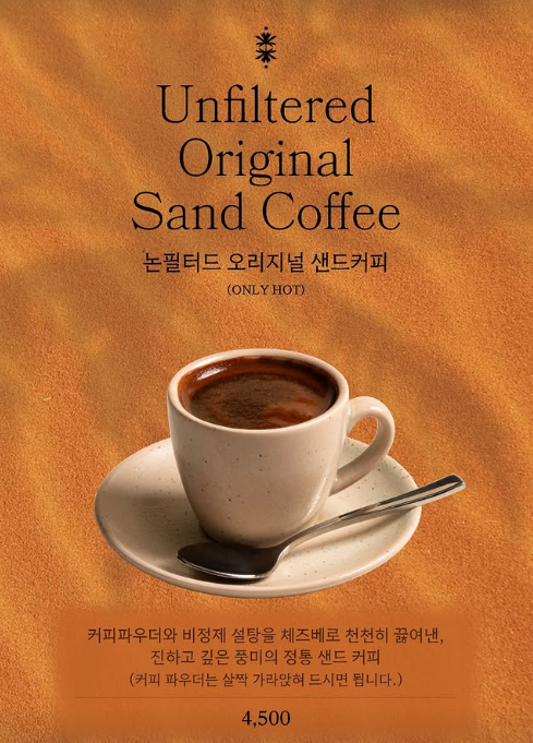 고운 모래 위에 커피포트를 올리고 천천히 열을 가해 끓여내는 이 방식은 보는 재미도 있어, 많은 방문객들의 시선을 사로잡고 있습니다. 커피 애호가들 사이에서는 이러한 추출 방식이 제공하는 깊고 진한 맛이 큰 매력입니다.
