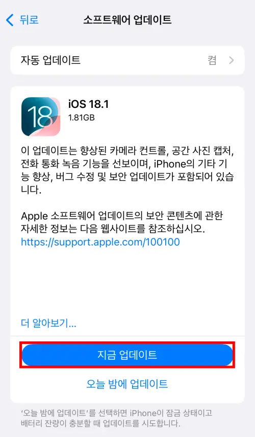 아이폰 통화녹음 업데이트하는 방법은 아이폰에 설정에 들어가 일반 > 소프트웨어 업데이트 > iOS 18.1 업데이트 > 지금 업데이트 버튼을 클릭하면 업데이트가 실행됩니다.