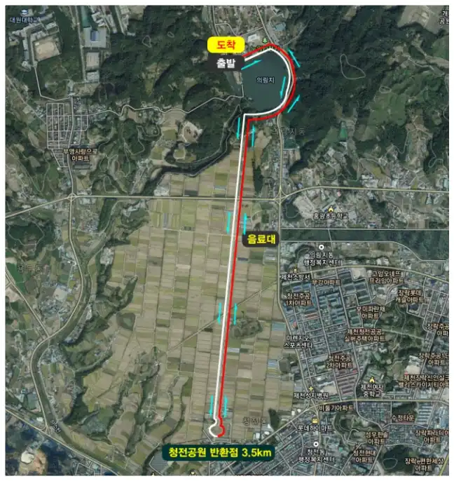 마라톤 코스는 의림지 수변무대에서 출발하여, 청전공원 반환점을 돌아 다시 의림지로 돌아오는 7km 코스입니다.