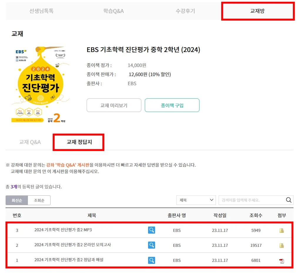 3. 아래로 내려서 교재방을 클릭 후 교재 정답지를 클릭하여, 기출문제를 다운로드합니다.