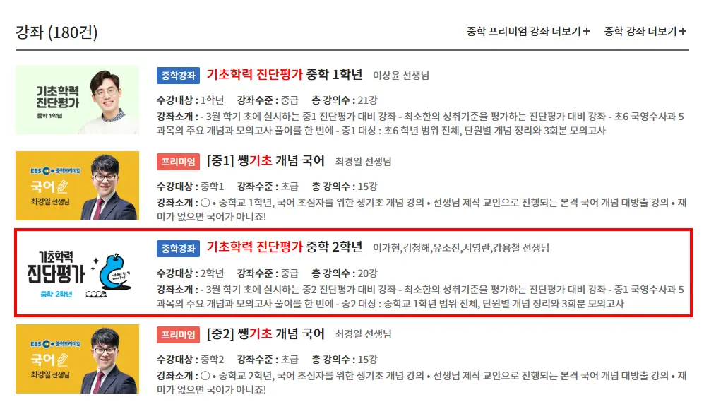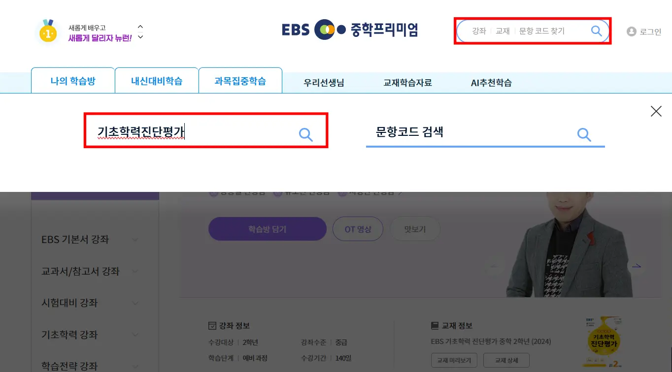 1. EBS 중학프리미엄 사이트에 접속하여 검색창에 '기초학력진단평가' 입력합니다.