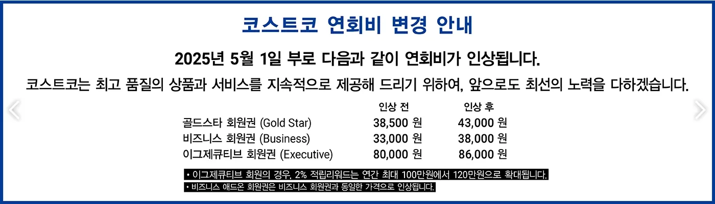 코스트코 연회비 인상은 2025년 5월 1일부터 인상된 가격으로 갱신이 됩니다.