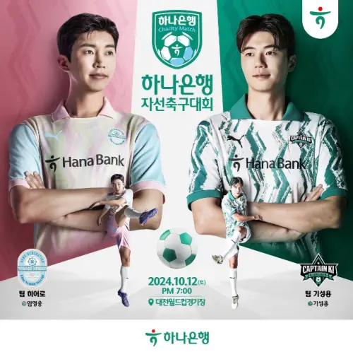 하나은행 광고모델인 임영웅과 함께하는 하나은행 자선축구대회가 2024년 10월 12일 토요일 대전월드컵경기장에서 축구선수 기성용 선수와 진행됩니다. 하나은행 자선축구대회 수익금은 사회취약계층 지원을 위한 돕는 데 사용되며, 팀 히어로와 팀 기성용으로 두 팀의 대결로 기대됩니다.