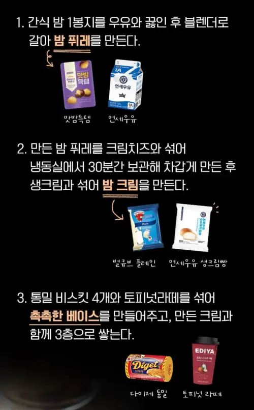 - 다이제 통밀 4개를 토피넛라테와 섞어 베이스를 만든 다음 밤 크림과 함께 3층으로 쌓아줍니다.