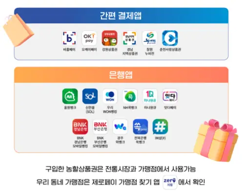 - 간편 결제앱 : 비플페, 오케이페이, 강원상품권, 경남지역상품권, 창원누비전, 춘천사랑상품권