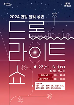 1,000대의 드론이 불빛 그림을 만들어 한강 밤하늘을 수놓는 2024년 드론 라이트쇼 상반기는 4월 27일부터 6월 1일까지 잠실 한강공원에서 오후 7시부터 오후 8시 15분까지 진행됩니다. 2024년 드론 라이트쇼 하반기 공연은 9월부터 10월중 총 5회 진행이 될 예정입니다.
