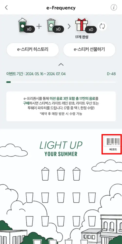 스타벅스 모바일 앱 또는 홈페이지에서 등록된 e프리퀀시 바코드 화면 또는 스타벅스 카드로 미션음료 3잔을 포함한 총 17잔 음료를 구매하면 e스티커가 적립됩니다. 음료는 매장에서 하루에 한 번 주문, 최대 20잔까지 주문이 가능합습니다.