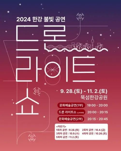 한강 불빛공연 드론 라이트쇼는 서울 대표 야간관광콘텐츠로 2024 하반기 한강 드론쇼가 9월 28일부터 11월 2일까지 진행됩니다. 1,000대의 드론이 밤하늘을 수놓으며, 빛과 음악이 각 주제에 맞게 공연을 펼치게 됩니다. 무료로 진행되는 공연으로 시원한 가을밤을 마음껏 느껴보세요.