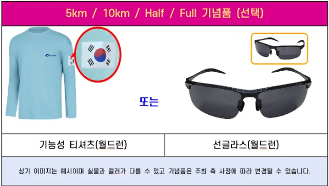 | 일반 | 5km | 30,000원 | 월드런 기념티셔츠 또는 선글라스, 손태극기, 완주메달 | 1시간 |
