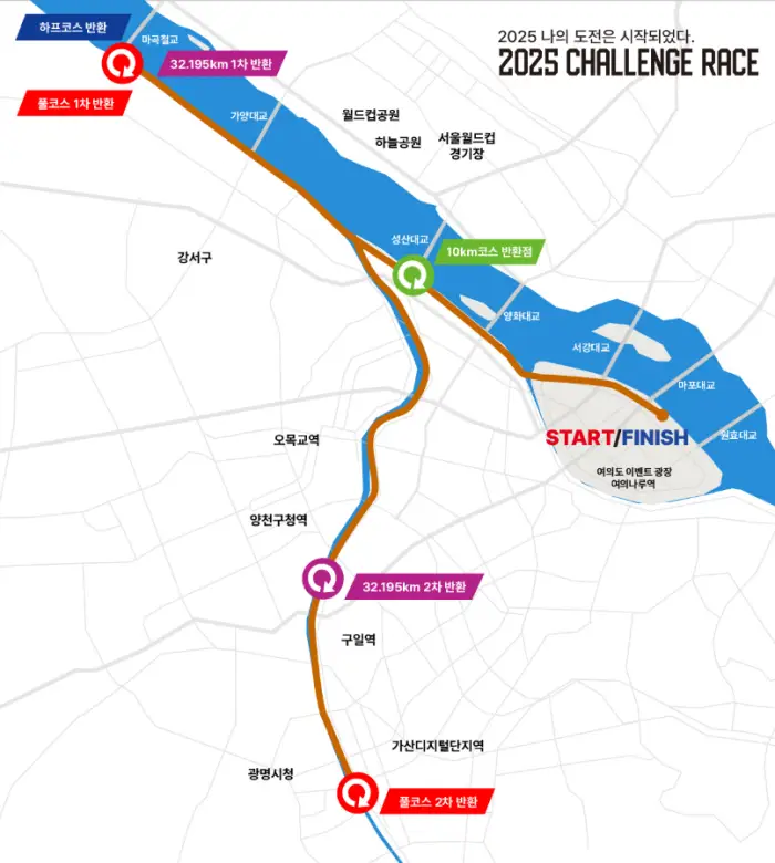 - 32.195km : 여의도 이벤트광장 - 성산대교 - 마곡철교(1차 반환) - 안양천 합수부 - 신정교(2차 반환 안양천) - 안양천 합수부 - 여의도 이벤트광장