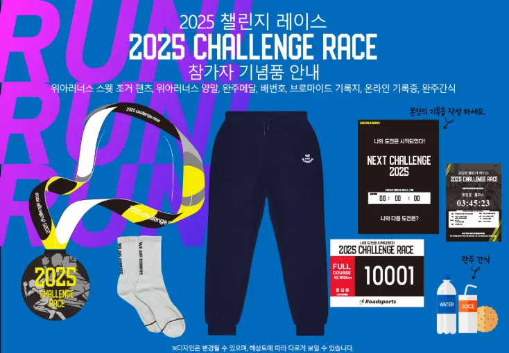 챌린지 레이스 참가자 하시는 분들에게는 아위러너스 스웻 조거팬츠와 양말, 완주메달, 배번호 브로마이드 기록지 등을 드립니다. 완주시 간식까지 받아 가세요.